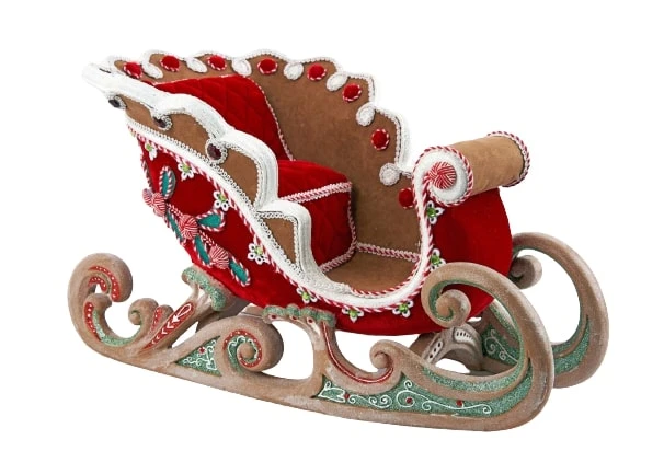 The Gingerbread Sleigh measures 13.75×11.5×11 inches. The sleigh is decorated in traditional gingerbread confection style with white piping and green and red accents. The red and white braided piping looks like candy canes while the round ones look like peppermint candies. A lovely display on a mantel or tabletop. This collection boasts a particularly cheerful Katherine?s Collection Santa and a gingerbread sleigh that looks good enough to eat. Ginger and Snap, this line?s two 24-inch elf dolls, stand at the ready, while the Gingerbread Man proudly brandishes a platter fit for any holiday treat. Even our Captain Cook E. Crumbs nutcracker is ready to join the confectionary celebrations with his frosted hat.