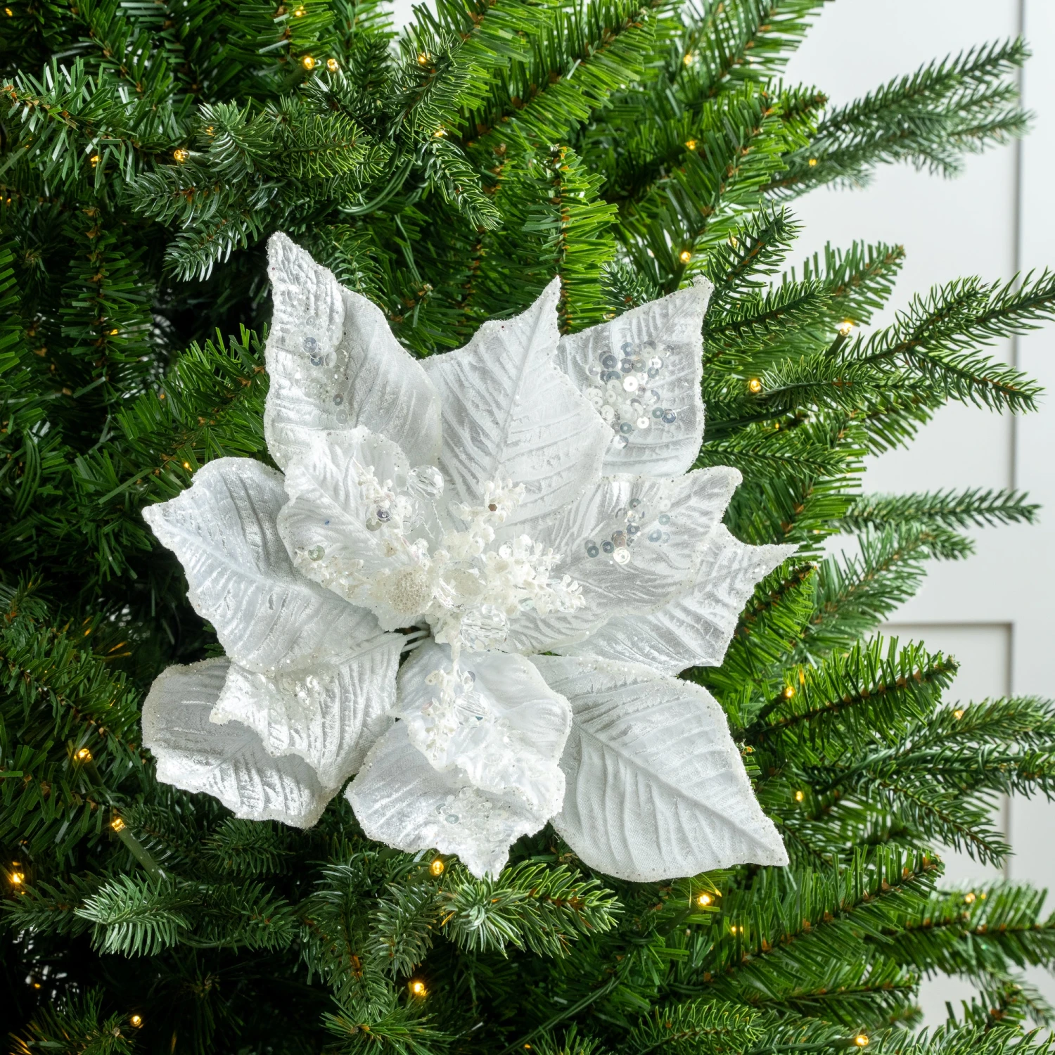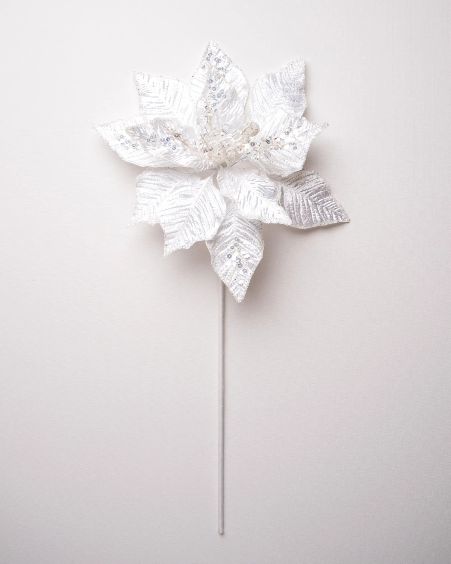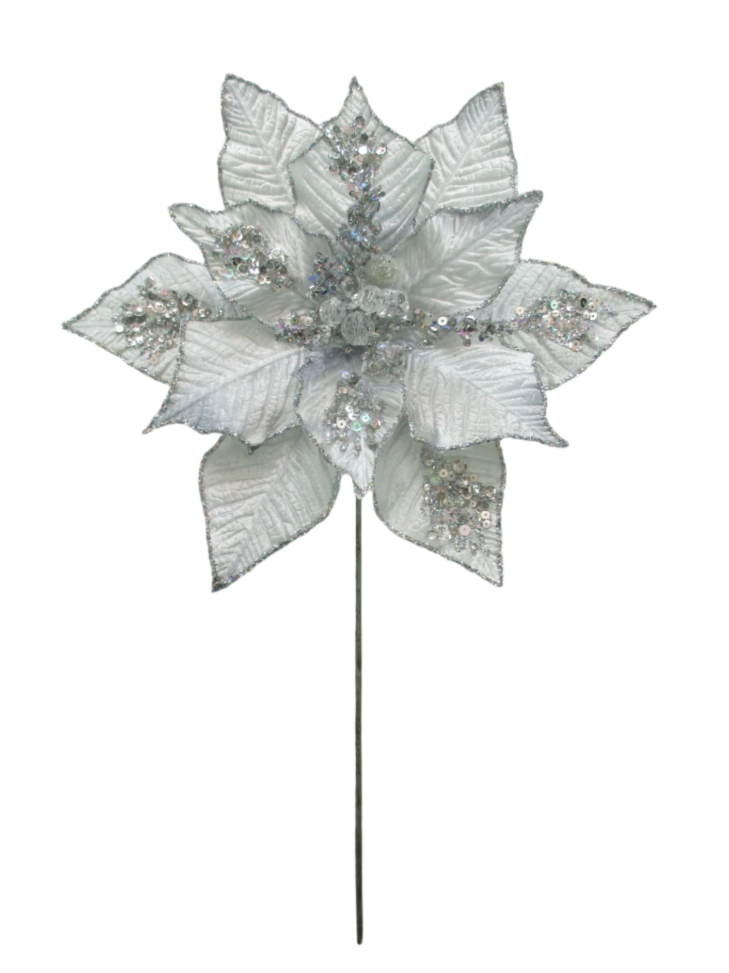 Our flowers feature a beautiful array of unique picks complete with contrasting pieces like this striking green and silver poinsettia pick. The bright rich green petals have an icy silver decor allowing the beautiful textures to stand out. Create a picturesque environment by filling your trees, wreaths, and garlands with this captivating piece.