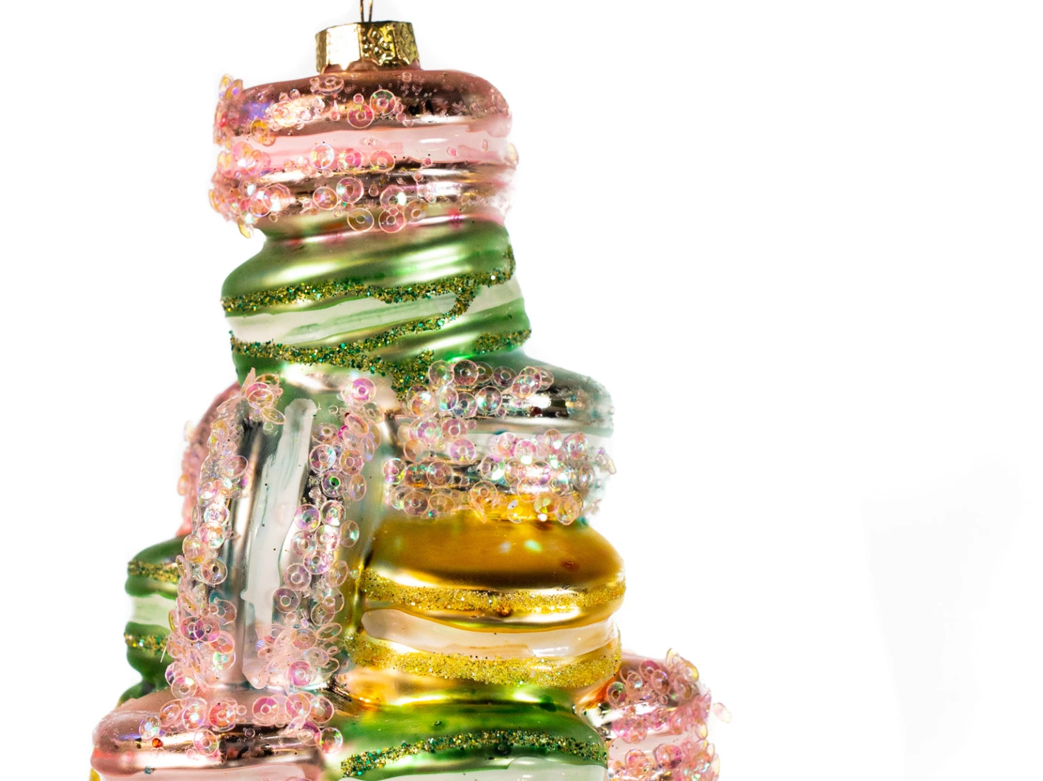 Oh my! A mountain of macarons! This will make a sweet addition to your Christmas tree. The unique ornament features a stack of glittered pink, green, blue, and yellow macarons piled high on a silver glittered pastry stand.