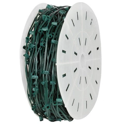 Perfect for outdoor and commercial use! This is a 1000′ roll of green wire with 12″ spacing for C7 light bulbs. You can create your own pattern using incandescent or energy efficient lights. Wrap trees, poles, string along your home… The possibilities are endless! Look for our C7 replacement bulbs in a variety of colors.
