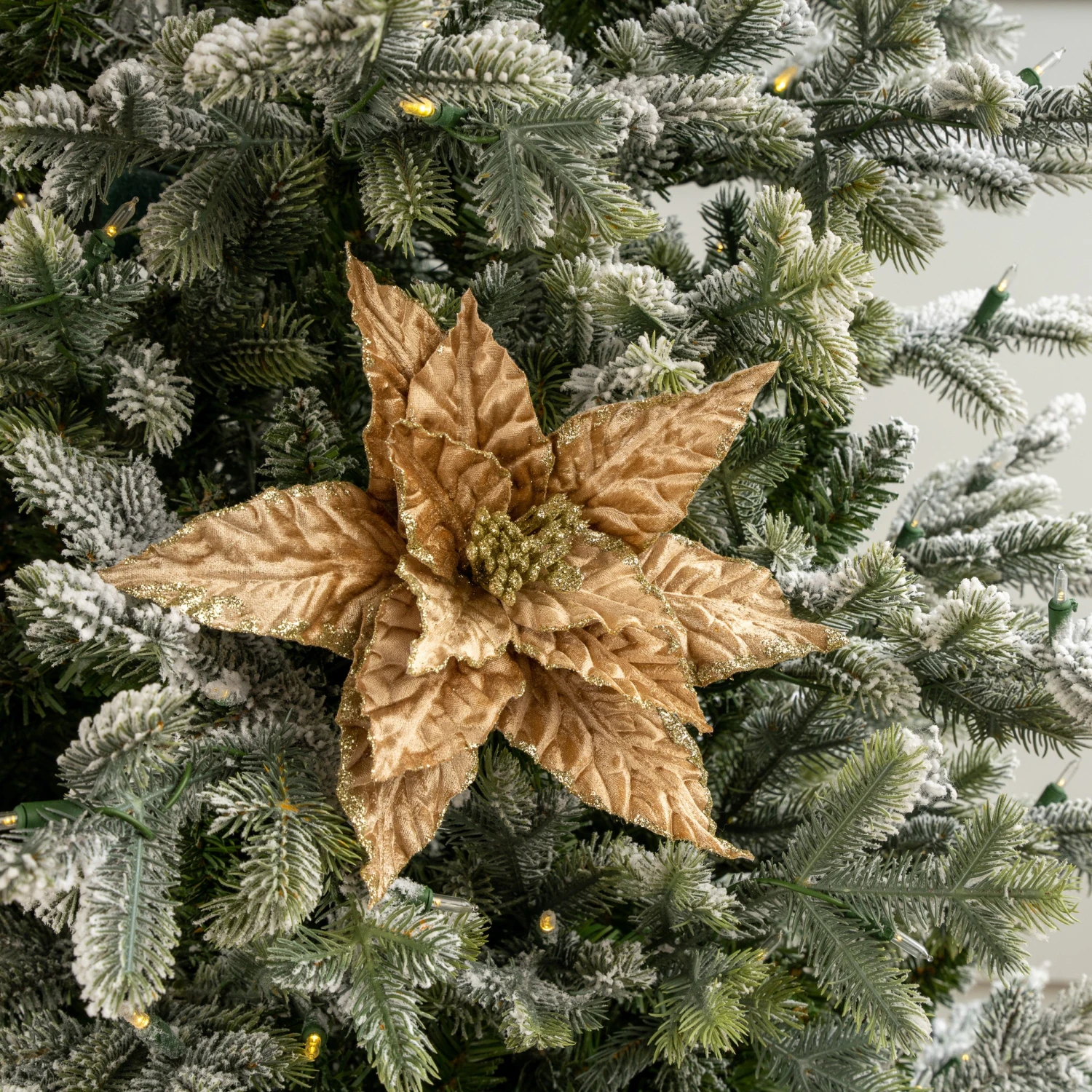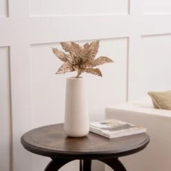 This beautiful and vibrant stem adds an elegant twist to the classic red Christmas poinsettia. The taupe velvety petals are brought together by a silver center. This luxurious yet timeless flower is perfect to display in a vase, tree, wreath, or garland.