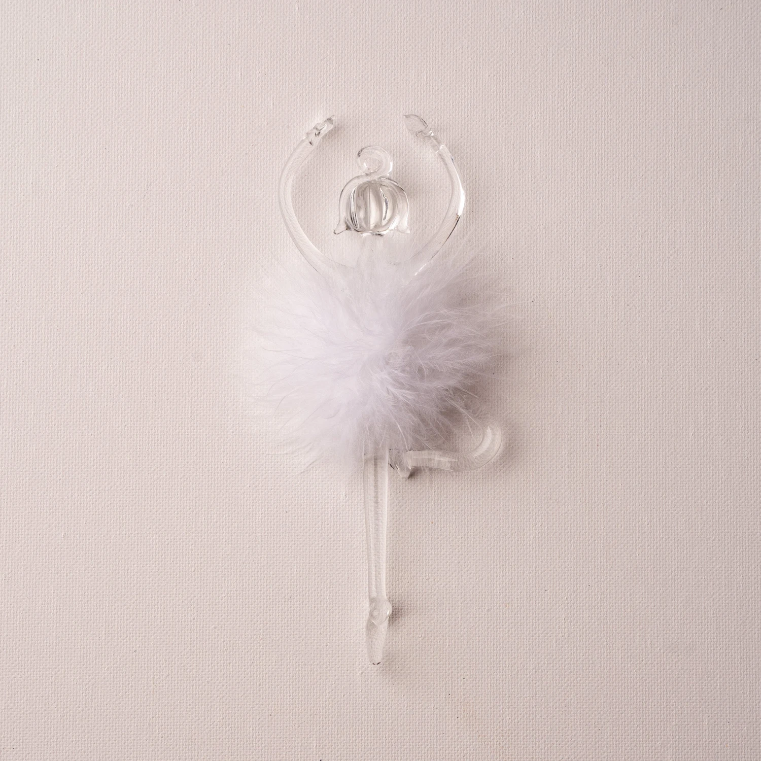 Bring charm to your holiday decor with this set of 6 glass ballerina ornaments. Each clear glass figure is adorned with a white feathered tutu, creating an enchanting and whimsical look. Add a bit of grace and beauty to your festivities!