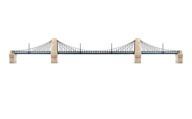 Whether you have a layout of countryside hills or a river running through the city, the grand suspension bridge kit is a guaranteed must-have. The painted brick detailing and railings make this bridge not only a fantastic layout addition but also a gift for the train collector in your life! This bridge has clip-together assembly with self-adhesive brick finish. No tools or glue are required.