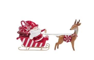 Delight loved ones with this magical Santa sleigh! This festive table top decor features Santa happily sitting in his candy cane-themed sleigh overflowing with peppermint candies and pulled by his reindeer. Make this winter season special with a delightful holiday accent!